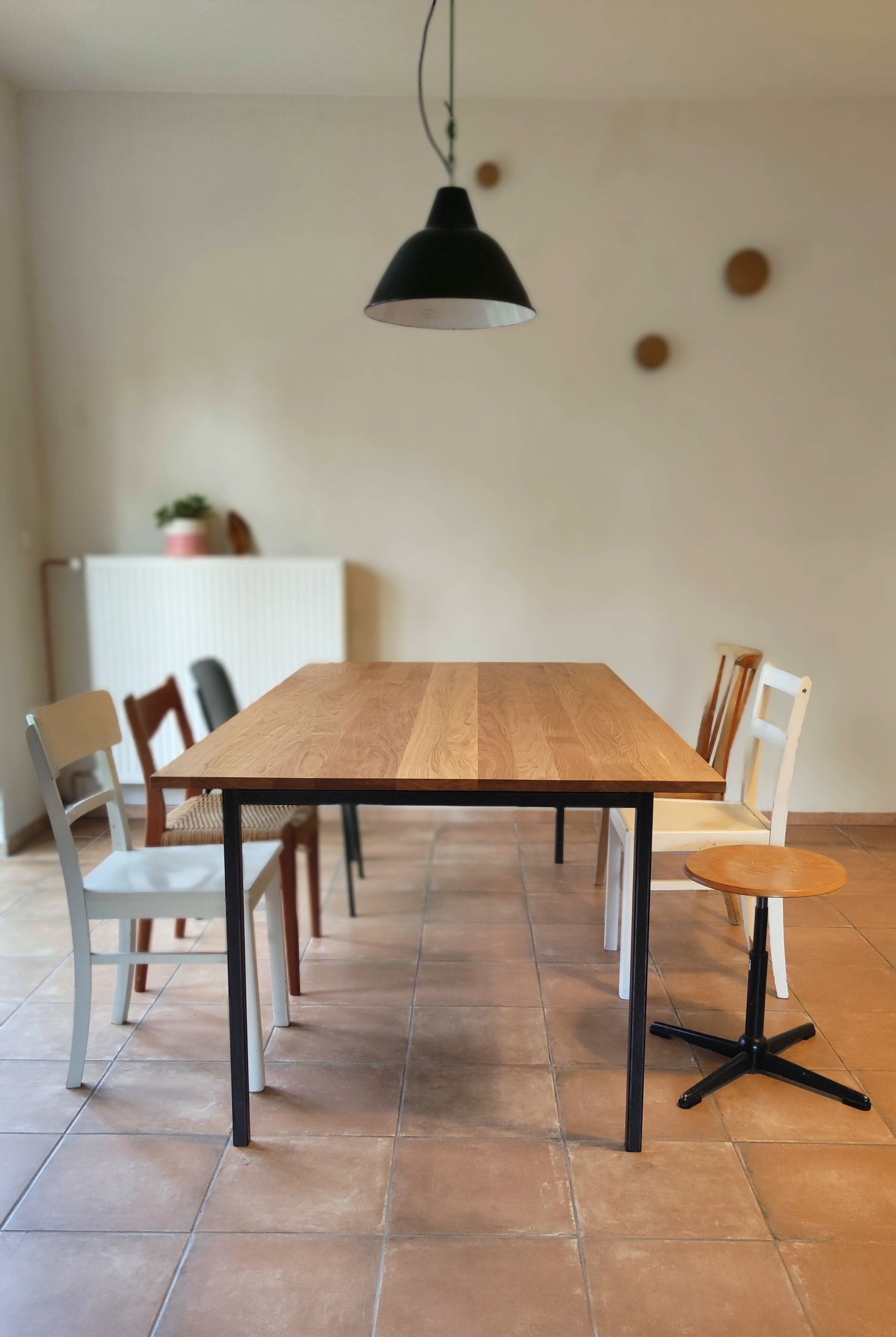 Die Tischplatte wurde aus sorgfältig ausgewähltem Eichenholz von Hand gefertigt. Die Auswahl des Holzes ist mir besonders wichtig um ein harmonisches Bild der Oberfläche zu erzeugen. Die Tischplatte wurde von Hand mit einem natürlichen Öl behandelt und anschließend mit Wachs versiegelt. So erhält der Tisch eine seidenmatte und gerade für Kinder wichtige lebensmittelechte und natürliche Oberfläche.